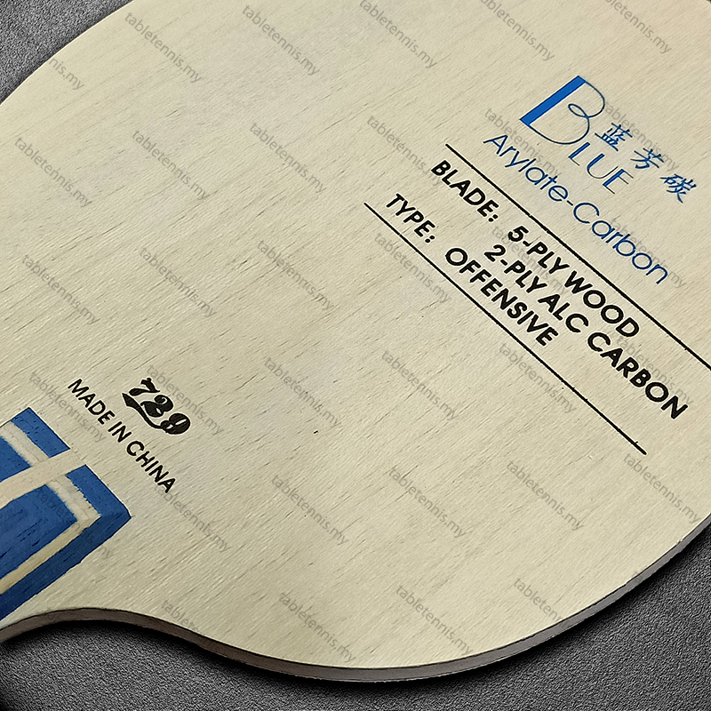 729 Blue 7 Arylate Carbon Blade has strong elasticity, plentiful internal power, and fast speed. This blade has a nice playing feel and control like a pure wood blade, and it has fast speed and strong elasticity like a carbon blade.